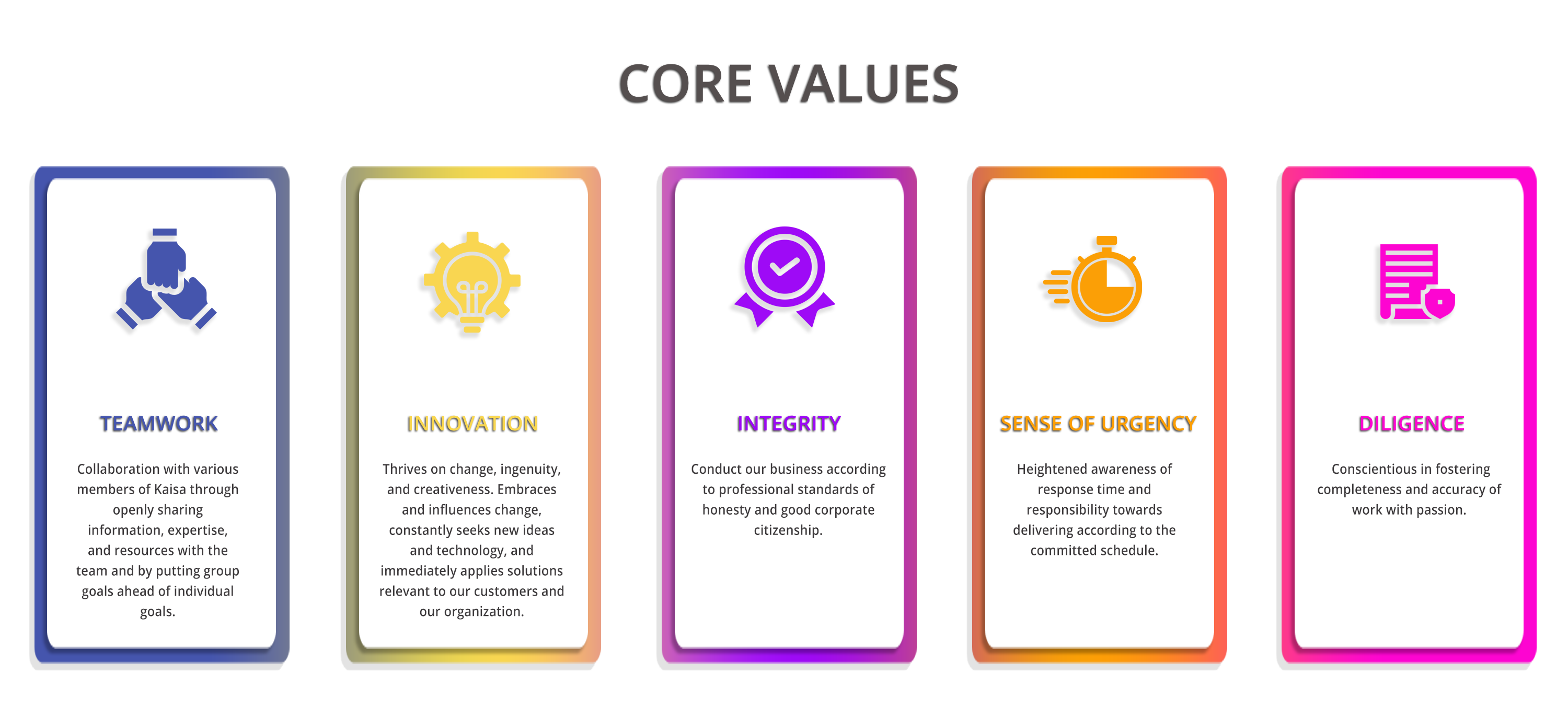 Kaisa is the trusted partner in enabling technologies to become business solutions for enterprises in the region. We are committed to providing quality products and services delivered by highly competent professionals. We are innovators supported by excellent delivery models committed to providing solid and consistent performance to our stakeholders.